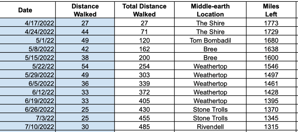 Rachel walked 30 miles this week | 1315 miles to Mordor