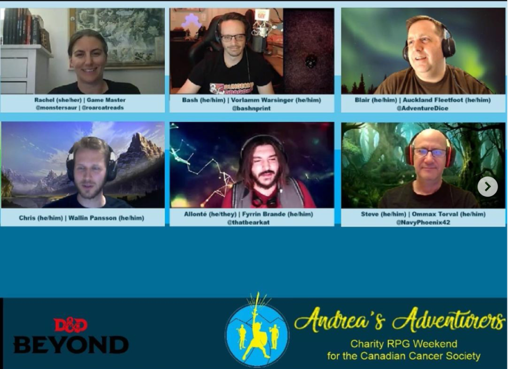 We hope folks will join us June 5-6, 2021 for Andrea’s Adventurers Charity RPG Livestream! We’ll have two days on the TCTC twitch (@terminalcitycon) featuring some fun RPG adventures while we try to raise $5,000 for the Canadian Cancer Society. More details coming soon, but if you watch the TCTC, Adventure Dice, or my own twitter accounts there will be more details coming soon.