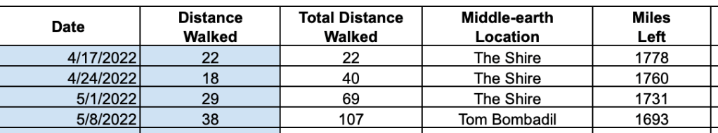 Our Fellowship has grown by one. My brother Roy is joining the trek and has started tracking his miles and he heads out from The Shire. If you want to join us, let me know and we’ll all encourage each other as we desperately try to keep up with Rachel. “This Ring isn’t going to destroy itself,” she said when I complained. Well then. On to week three!