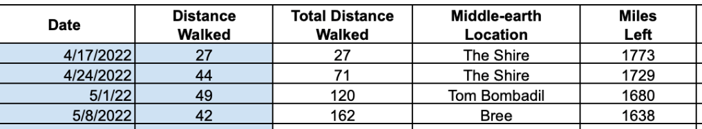 Tricia walked 22 miles this week | 1350 miles to Mordor Rachel walked 12 miles this week | 1221 miles to Mordor